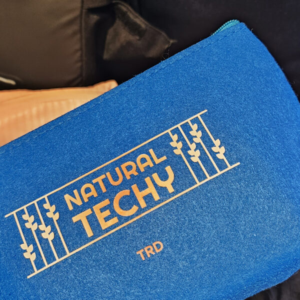 Odinė etiketė su įspaustu logotipu – logotipas spaudžiamas į eko veganišką odą; stilingas, tvarus pasirinkimas.
